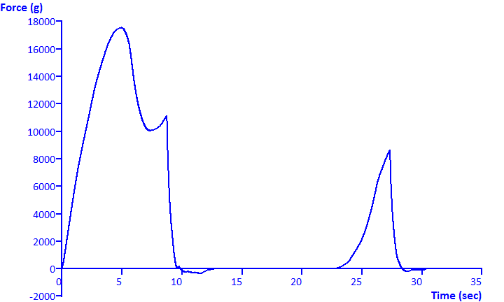 不是所有的产品都有脆性,但是在探头第1次压缩样品的过程中,当它们破裂时,在曲线有第1个峰的位置(在该处力值下降),出现脆性点。 | |||||