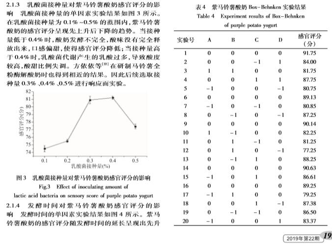 【摘要】:本实验在单因素实验的基础上,以模糊数学感官评分为指标,通过响应面实验设计对紫马铃薯酸奶的工艺及配方进行了优化,得到其*工艺配方为:乳酸菌添加量0.46%、发酵时间6.09 h、蔗糖添加量7.66%、紫马铃薯粉添加量5.90%、牛奶补足至100%。方差分析显示各因素对紫马铃薯酸奶感官评分的影响:蔗糖添加量乳酸菌添加量发酵时间紫马铃薯粉添加量。通过对紫马铃薯酸奶的质构指标进行主成分分析分析,提取出两个主成分,构建出了紫马铃薯酸奶的综合质构品质评价模型,应用此模型对紫马铃薯酸奶的品质进行评判具有可行性。