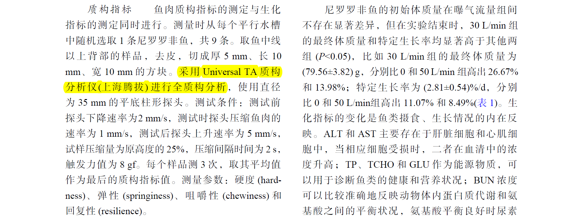 Technical articles2020年,国内期刊《水产学报》在线发表了华南理工大学土木与交通学院、中国水产科学研究院珠江水产研究所等研究人员题为"室内循环养殖系统中曝气流量对尼罗罗非鱼生长的影响"的研究论文。在该论文中,研究人员用上海腾拔仪器科技有限公司的Universal TA国产质构仪测定罗非鱼肉的硬度、弹性、咀嚼性和回复性等质构指标。