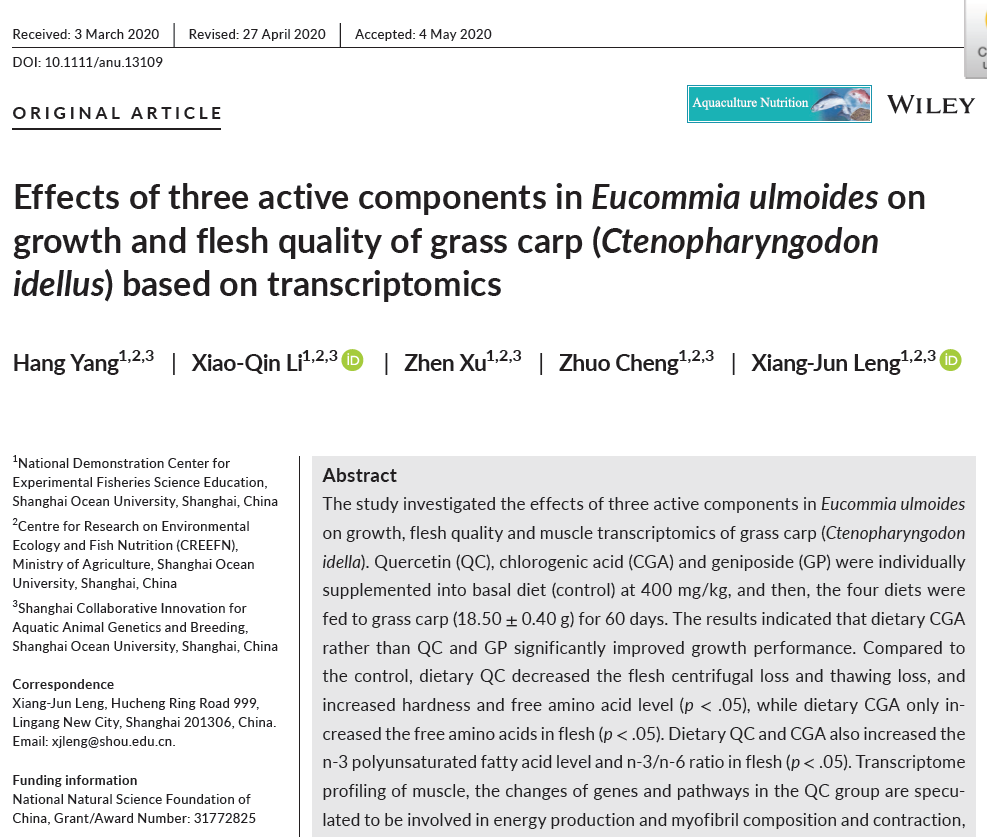 2020年5月,农林科学领域期刊《Aquaculture Nutrition》在线发表了上海海洋大学研究人员题为“Effects of three active components in Eucommia ulmoides on growth and flesh quality of grass carp (Ctenopharyngodon idellus) based on transcriptomics”的研究论文。