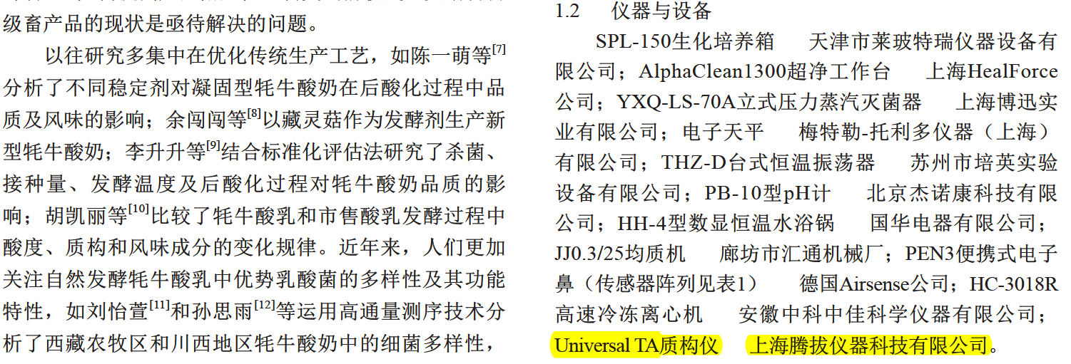 Technical articles2021年,东北农业大学食品学院研究人员在国内食品期刊《食品科学》在线发表了题为“含发酵乳杆菌HY01牦牛酸奶工艺优化及主体风味成分动态解析”的研究文章。在该论文中,研究人员使用上海腾拔仪器科技有限公司的Universal TA质构仪来测定牦牛酸奶的硬度、稠度、内聚性和粘性指标。