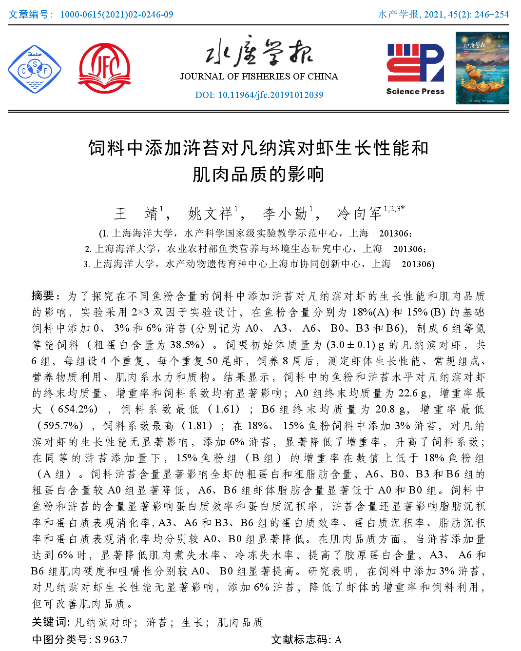 全文下载链接:饲料中添加浒苔对凡纳滨对虾生长性能和肌肉品质的影响