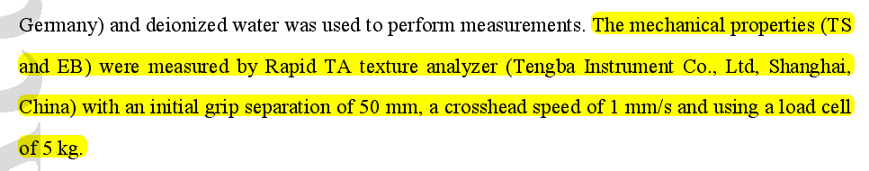 在第一篇论文中,研究人员使用上海腾拔Rapid TA质构仪测定纳米乳液基膜的拉伸强度和断裂伸长率以及蓝莓的硬度;在第二篇论文中,研究人员使用上海腾拔Rapid TA质构仪测定谷蛋白基膜的拉伸强度和断裂伸长率。