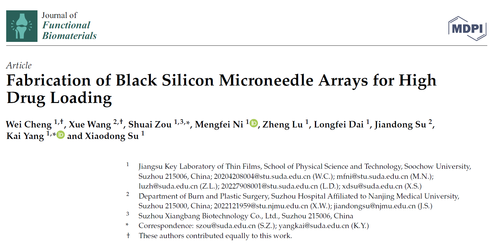 Technical articles近日,上海腾拔Universal TA质构仪助力苏州大学研究人员在国际期刊《Journal of Functional Biomaterials》(Q2,IF:4.8)发表了题为"Fabrication of Black Silicon Microneedle Arrays for High Drug Loading"的研究论文。