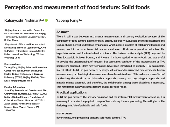 Texture Studies期刊综述—食品物性的感知与测试:固体食品