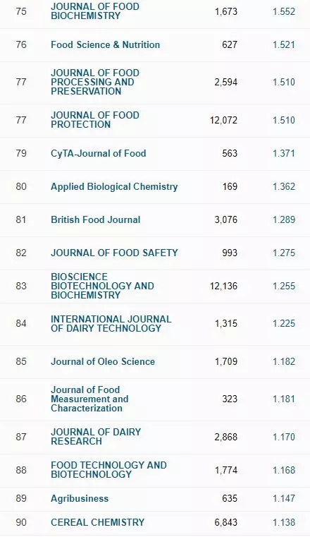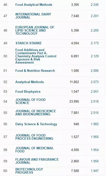 其中,食品科技类期刊2017年SCI影响因子排名如下: